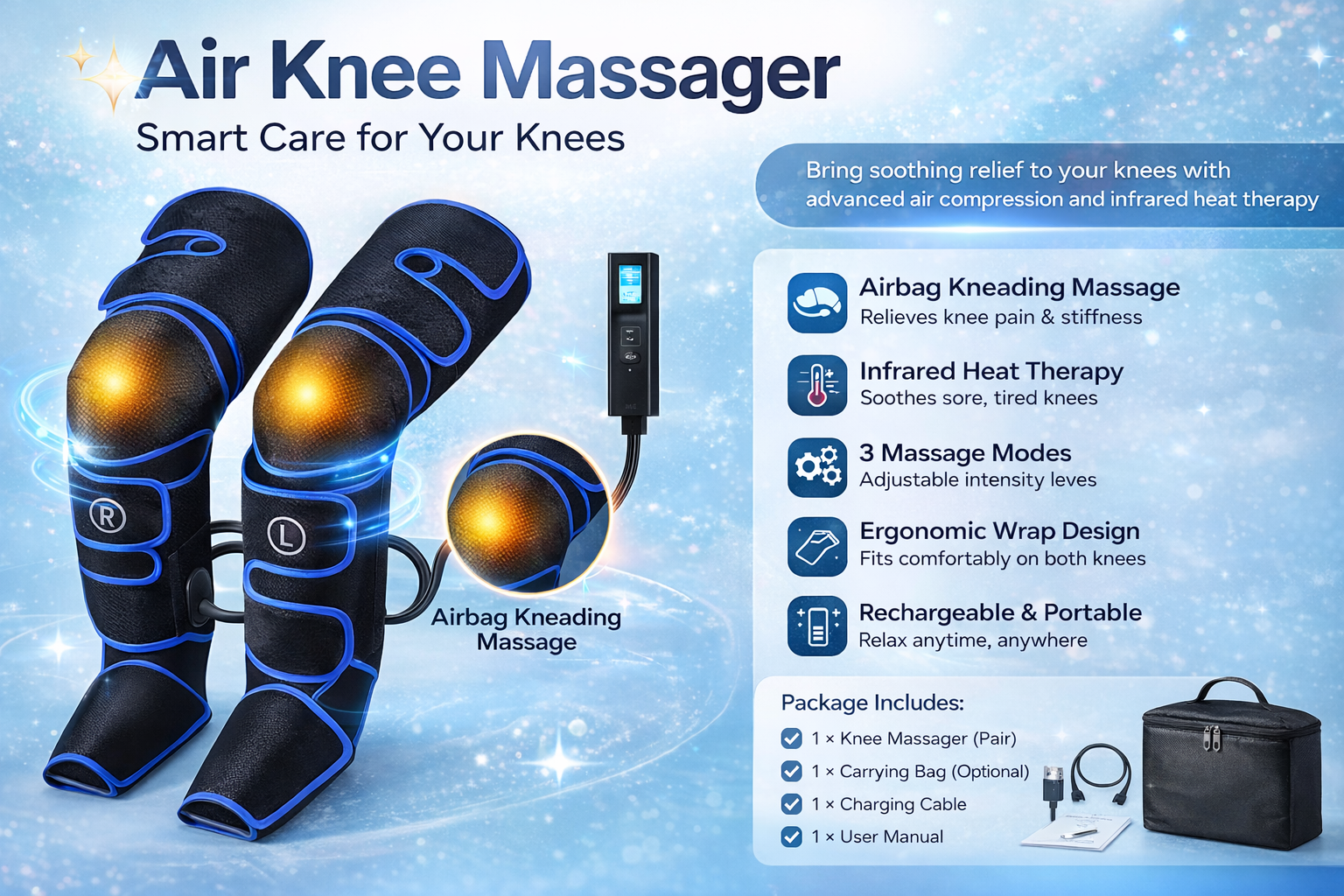 Airbag Kneading Massage β Provides gentle yet effective pressure around the knee for a professional massage experience
